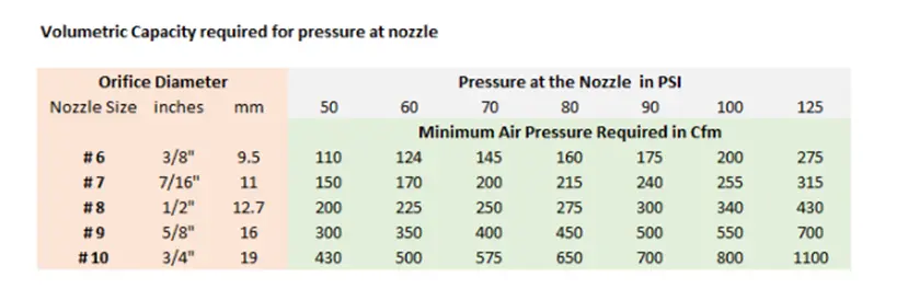 Zure tobera produktibo onena aurkitzeko, zehaztu zein toberaren presioa (PSI) mantendu behar duzun leherketa produktiborako, eta zure erabilgarri dagoen konpresoreak minutuko zer aire-bolumena eman dezakeen (CFM), gero kontsultatu hurrengo ataleko taula parametro horiek betetzen dituen pita-orifizioaren tamaina aurkitzeko.