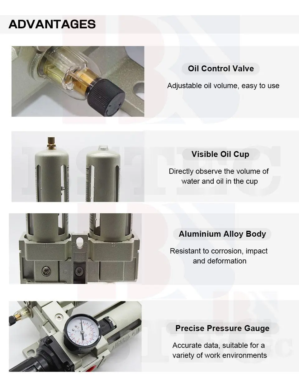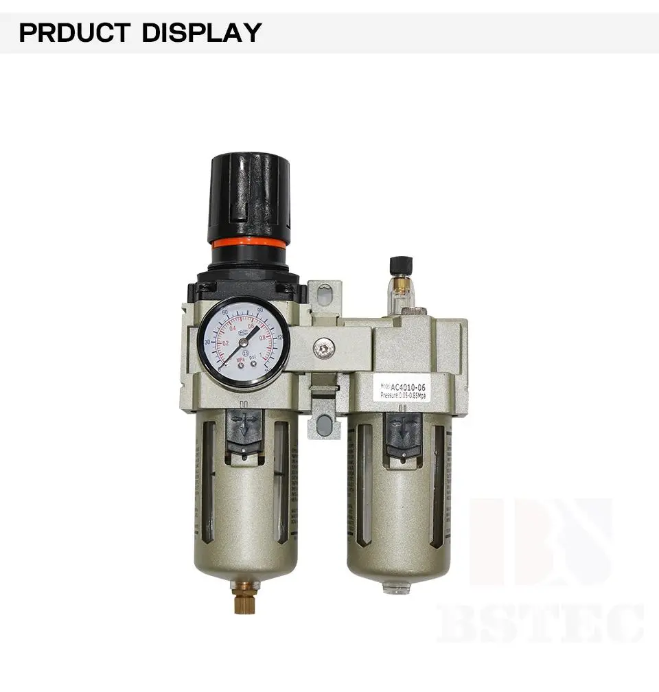 AC serieaHezetasun Bereizleasistema pneumatikoko presioa etengabe mantendu dezake aire erregulatzaile bat erabiliz, sistema pneumatikoko osagaiak kaltetu ditzaketen aire iturriaren presioaren aldaketa azkarrak saihestuz. Iragazkiek aire-iturria garbitu dezakete ura eta beste ezpurutasun batzuk bereiziz, airearen ertainaren kalitatea eraginkortasunez hobetuz. Lubrikatzaileek sistema pneumatikoari lubrifikatzailea eskaintzen diote, ondo funtzionatzen mantenduz eta sistema pneumatikoko osagaien iraupena asko luzatuz.