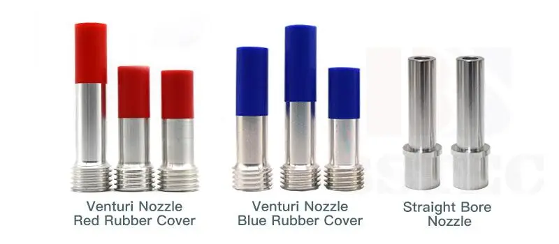 Nozzle toll dìreach: Tha e a’ toirt a-steach dà phàirt anns a bheil a’ chaolas a tha a’ tighinn còmhla agus am pàirt tollaidh dhìreach làn-fhad. Nuair a thig èadhar teann a-steach don t-slighe a-steach a tha a’ tighinn còmhla, bidh sruthadh meadhanan de ghràinean sodium bicarbonate a’ luathachadh airson an eadar-dhealachadh cuideam. Bidh na mìrean a’ fàgail an t-sròin ann an sruth teann agus a’ toirt a-mach pàtran sèididh dlùth air buaidh. Thathas a 'moladh an seòrsa nozzle seo airson a bhith a' spreadhadh raointean beaga.