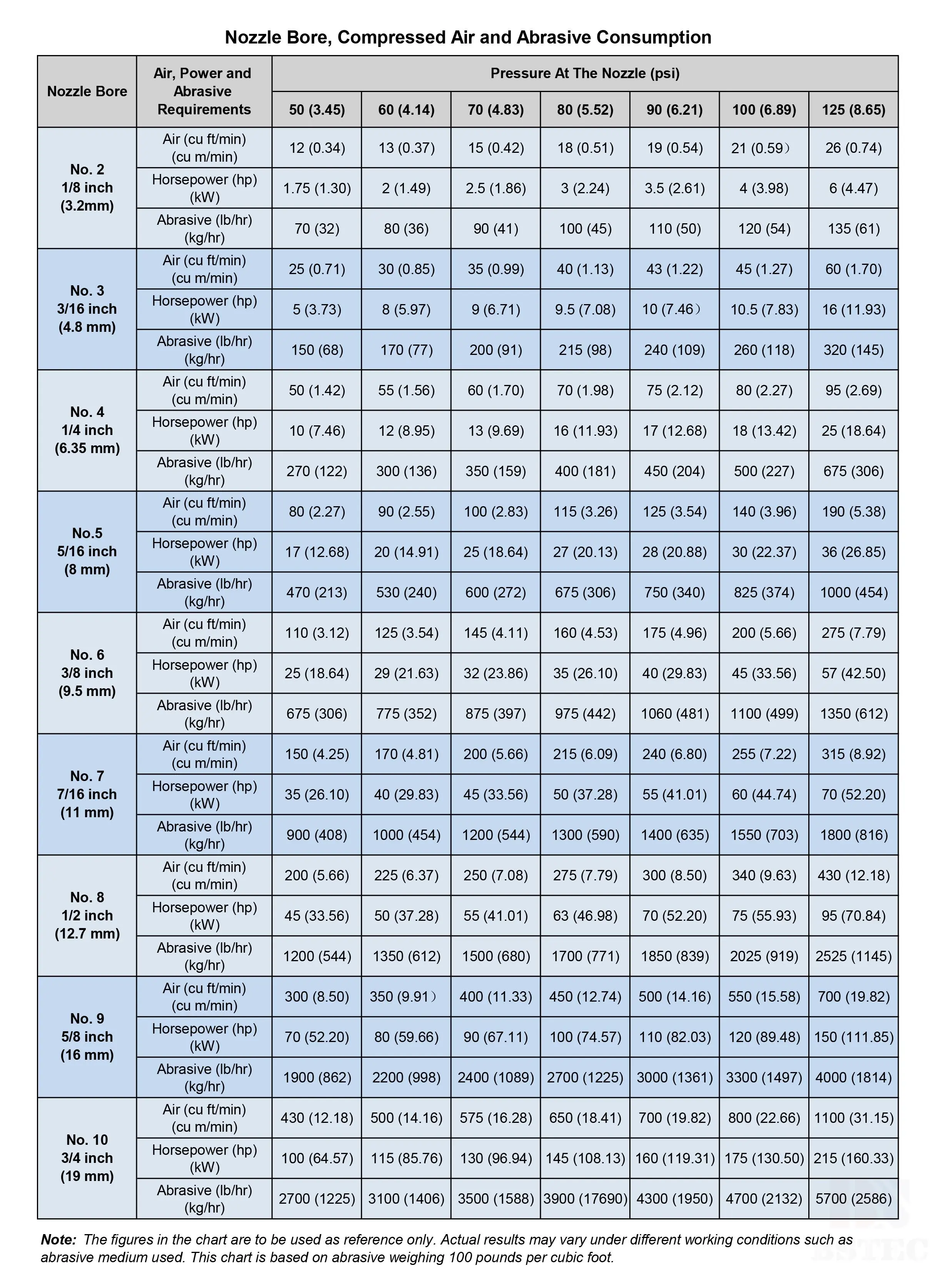 O seguinte gráfico mostra a correlación entre o tamaño do orificio da boquilla, o volume de aire e a presión da boquilla que se usan a miúdo na industria, o que lle dará orientación para seleccionar un tamaño de boquilla adecuado e maximizar o seu traballo de granallado.