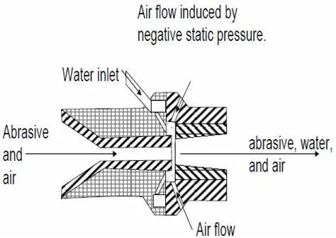 Dlo Endiksyon Bouch: Kòm figi a montre, fòs lè a pouse patikil abrazif nan inlet konvèje a nan yon chemen kout dwat. Nan mitan chemen an, koule lè ak dlo yo trase andedan, respektivman, pa yon tiyo ak anpil ti twou. Estrikti a tou swiv venturi aprensip efè.