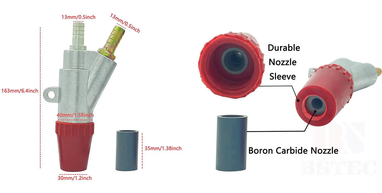 · Two types of abrasive inlets methods: thread type and straight-in type; for straight-in type, the abrasive inlet diameter is 22mm; for thread type, the abrasive inlet opening is 13mm; air jet openings are all 13mm