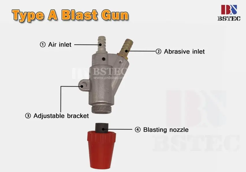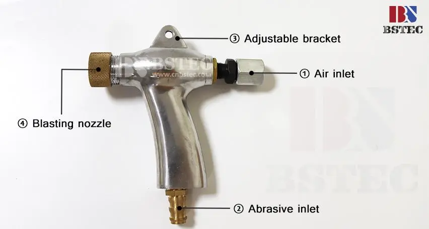 Tvær gerðir af slípiefnisinntaksaðferðum: þráðargerð ogbeint inn gerð; fyrir beina gerð er þvermál slípiefnisinntaksins 22 mm; fyrir þráðargerð er slípiefnisinntaksopið 13 mm; loftþotuop eru öll 13mm