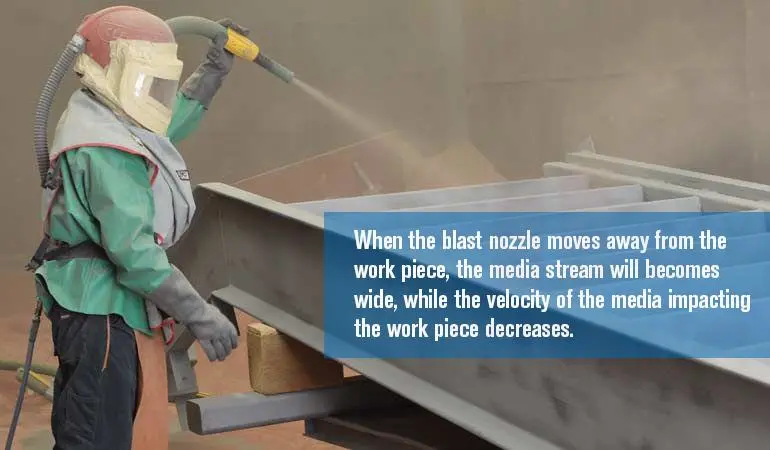 Razdalja peskanja od obdelovanca: Ko se peskalna šoba odmakne od obdelovanca, postane tok medija širok, medtem ko se hitrost medija, ki udari v obdelovanec, zmanjša. Zato mora operater dobro nadzorovati razdaljo peskanja od obdelovanca.